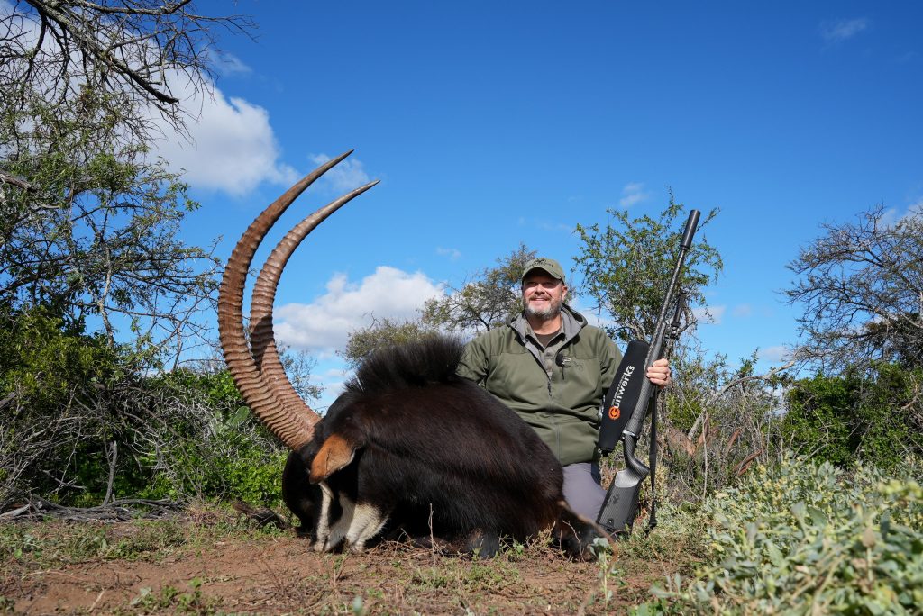 Identification:Large bodied animal. Black with a white belly. The face has white patterns on. Long back curved horns.